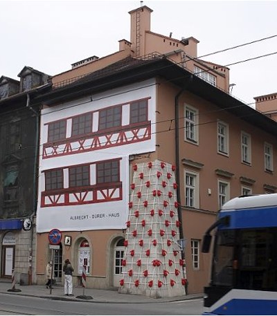 Das Nürnberger Haus hat sich zur Zeit in ein Dürer-Haus mit (falscher) Fachwerkfassade verwandelt. (Foto: Bielawka) Und an der Hausecke klettert ein Rudel roter Dürer-Hasen von Ottmar Hörl hoch. Die Plastik-Tiere sind so begehrt, dass der Hausmeister sie abends abschrauben muss, weil in den ersten Nächten etliche der Mümmelmänner geklaut wurden.